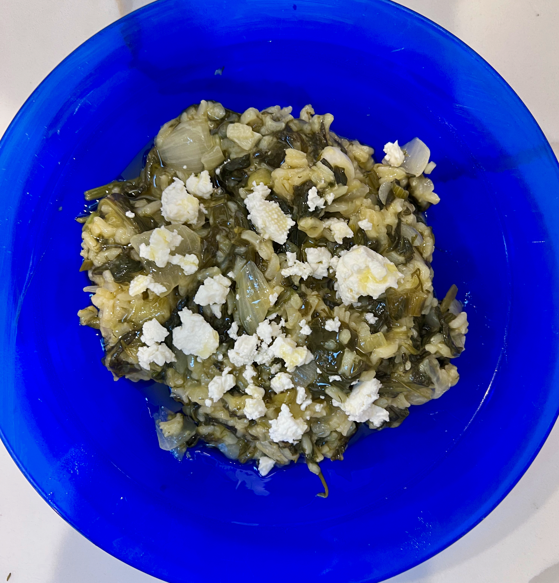 In dishes like this, the olive oil isn’t added at the end. It cooks with the rice and spinach from the beginning, which is what gives the dish its flavor.