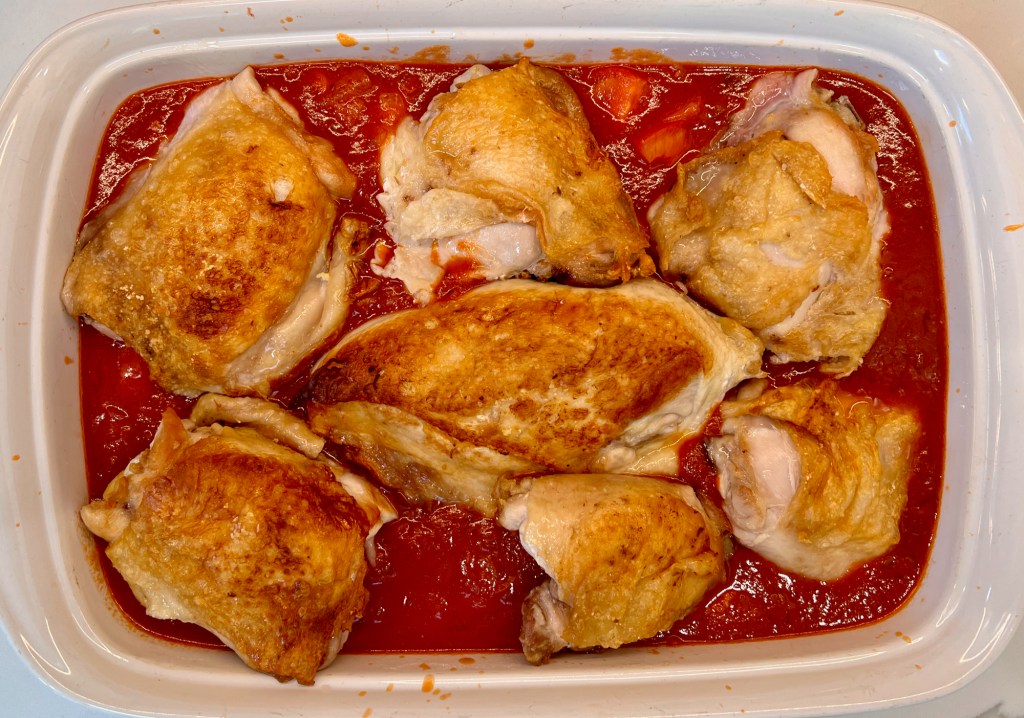 I have so much chicken and the pan can’t fit the whole dish. I don’t have a dutch oven that’s large enough, so I pour the sauce into a baking dish. I put chicken pieces on top, cover with foil, and place into a 375 degree oven. I bake for about 30 – 35 minutes.