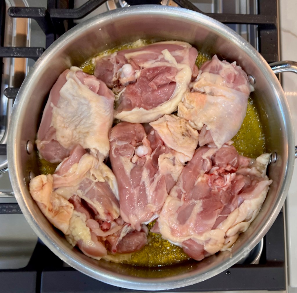 Season chicken with salt and pepper. Heat olive oil in a large skillet. Brown chicken skin side down for about 5 minutes at high heat untouched. You’ll get a nice crispy skin!