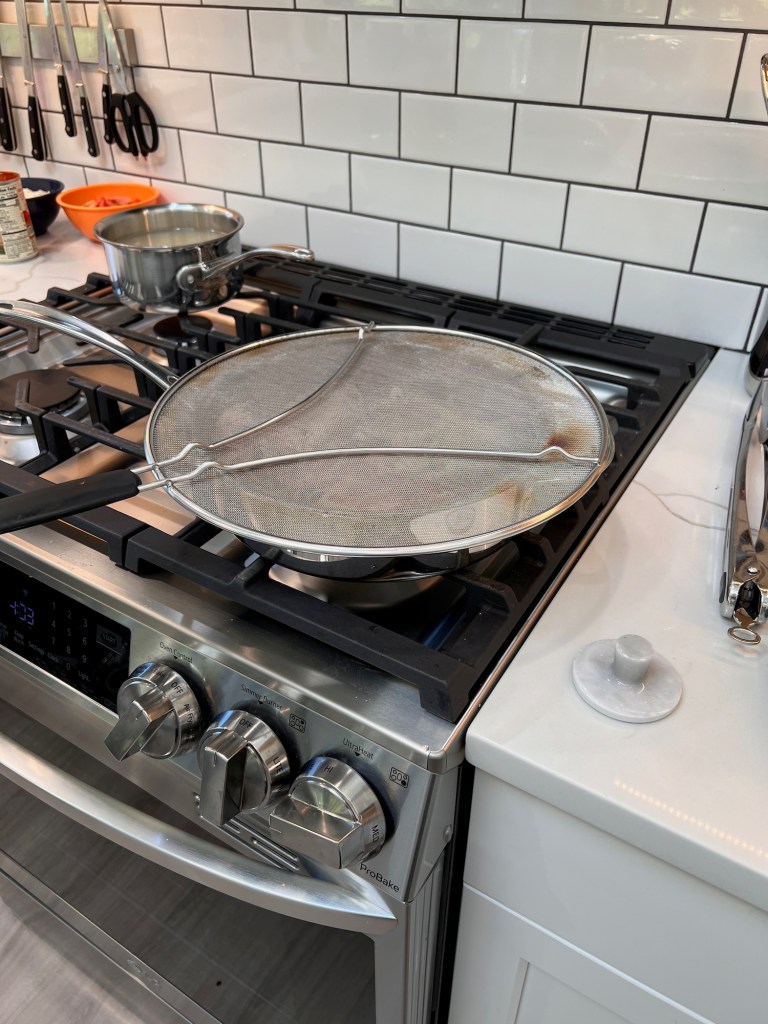 Once done, a trick I learned is to add a few ice cubes to the pasta. This keeps the orzo from getting gloppy and stops the cooking.