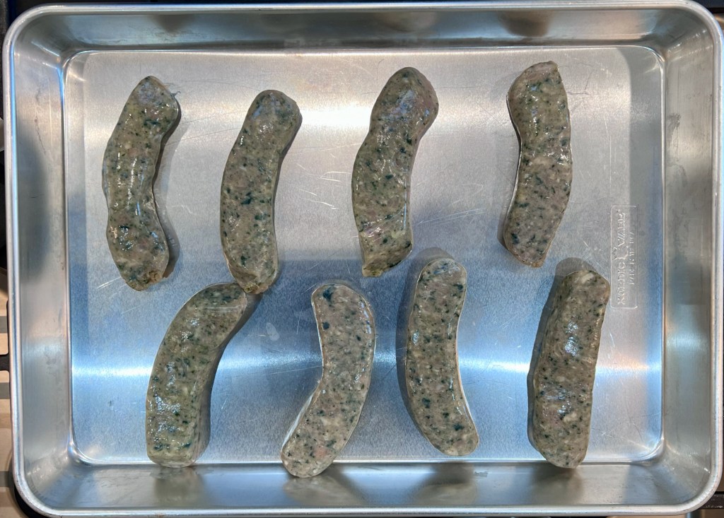 Normally is made with pork sausage, especially loukaniko. I couldn’t find any loukaniko where I live. I was about to use mild Italian sausages. Then I ran across some chicken, spinach, and feta sausages. Had to try it with that.