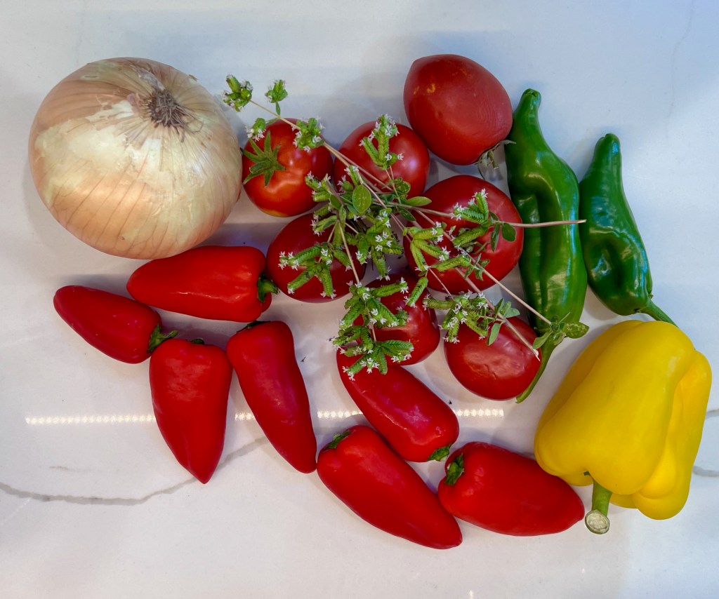 I’ve had a bumper crop of peppers growing this year and this was a perfect vehicle for this dish. One of my pepper plants, the Anaheim, is a whole lot spicier than I expected. It is producing some of the hottest Anaheim peppers I’ve ever had. IT made me wonder if they are actually Hatch peppers. I also grew a pimento, a yellow bell, and a small red.