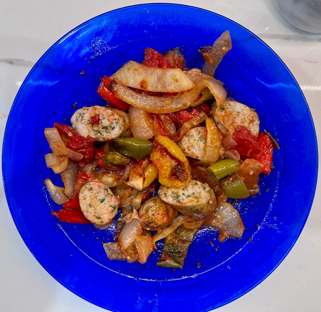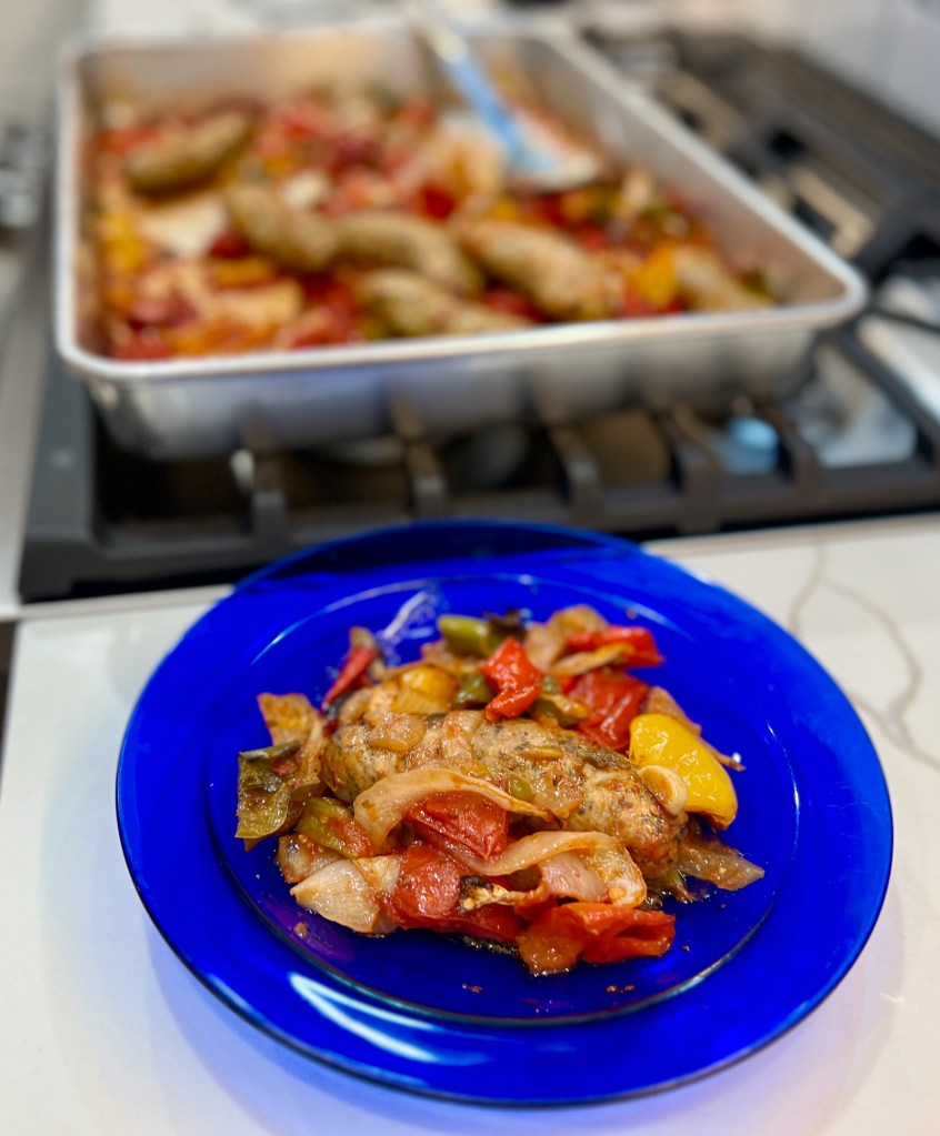 Decided to do another twist on a traditional Greek dish. Spetzofai is a spicy sausage and pepper stew cooked in a tomato sauce on the stovetop that originated in Thessaly. It’s quite rustic and really warms you up in the cooler months. Usually it’s eaten as a main dish with some crusty bread. It is also served as a meze with some other nibbles and wine. Sometimes, it’s made quite saucy and served over noodles or rice even. My batch wasn’t as saucy.