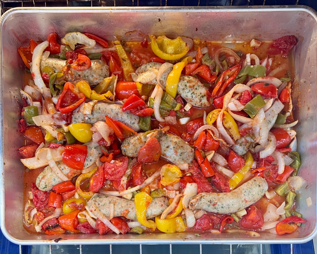 Toss every 15 minutes or so to evenly cook. After about an hour, check to see if the sausages are cooked through. It take closer to 90 minutes depending on the density of the items.