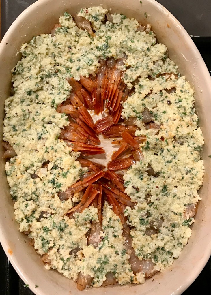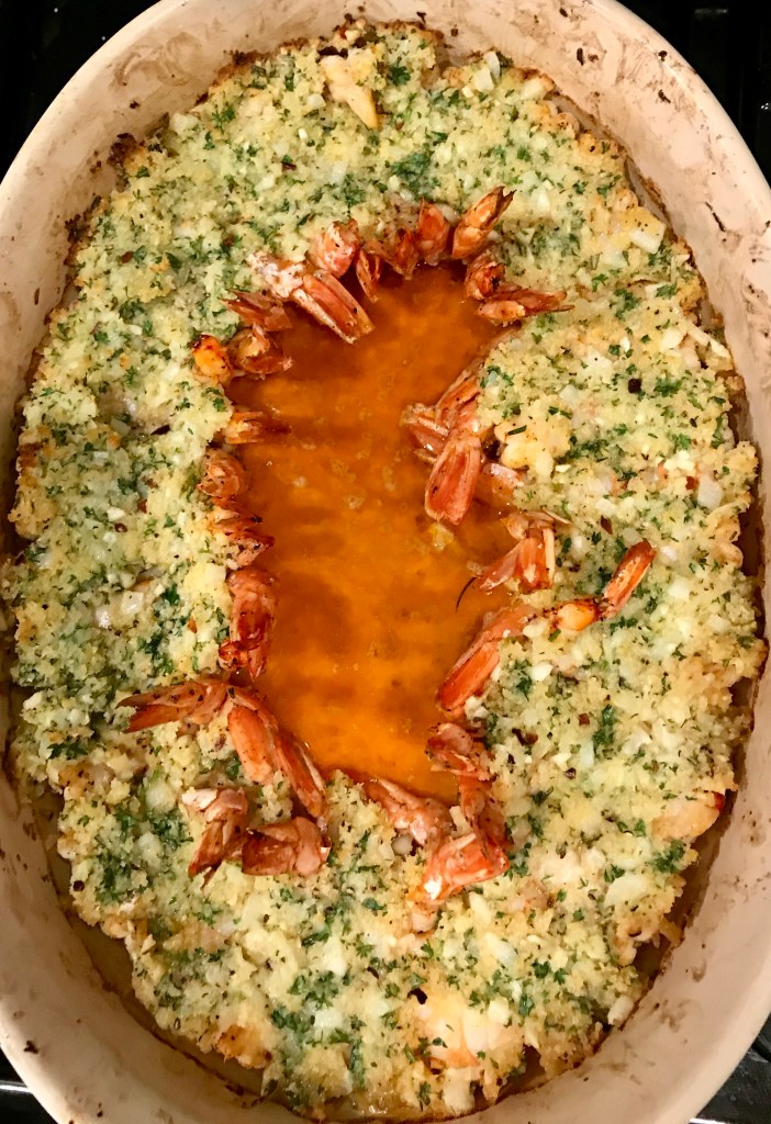 After the Celery Gratin recipe, I got on a gratin kick. Here’s a rich and decadent way to make shrimp. It’s quite rich, so this can be an app for a get together. Plus, the circular look makes it a big hit.