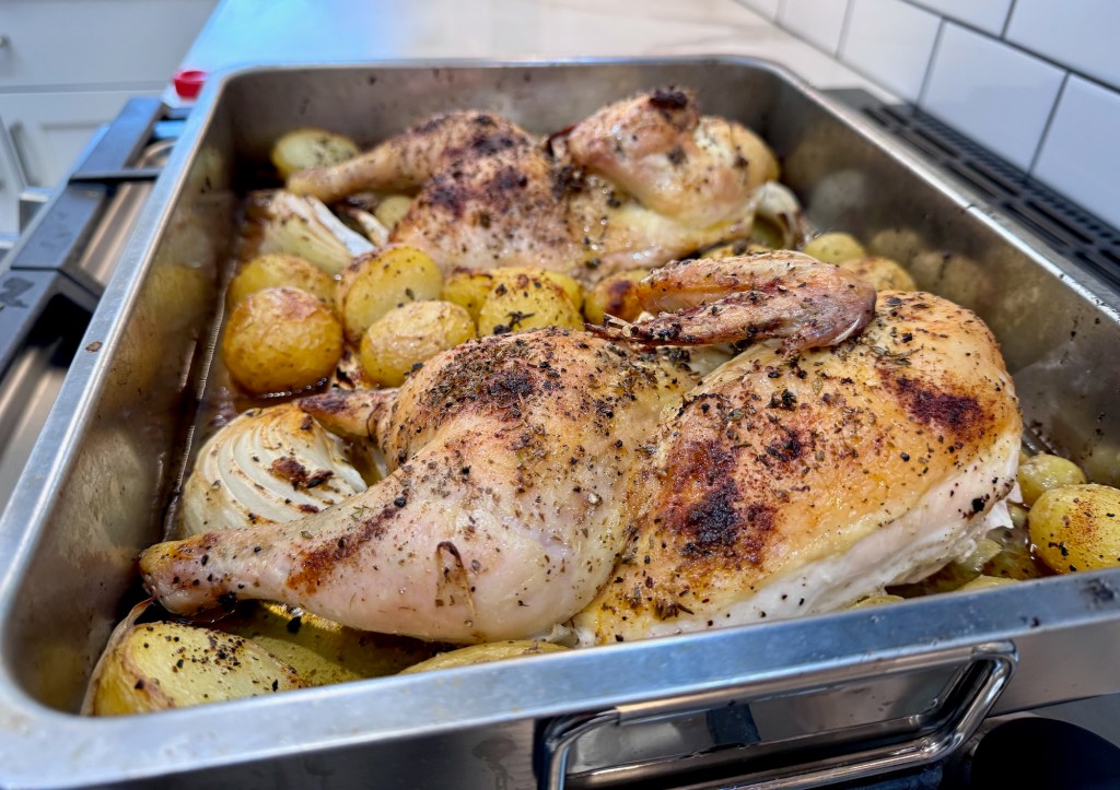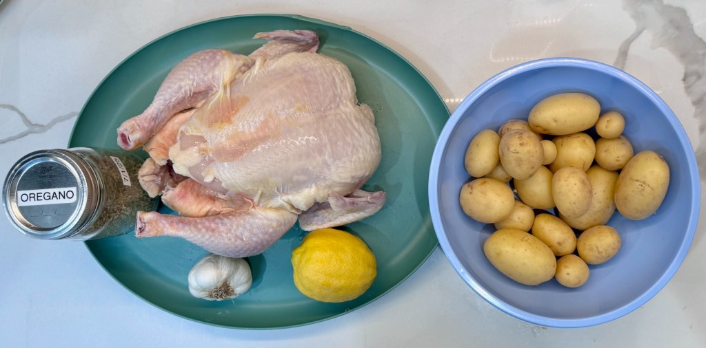 The basic recipe is simple. Put a chicken in the pan. Add potatoes. Cover with some olive oil and lemon. Sprinkle some oregano on it. Roast. There are endless combinations of just how to make this.