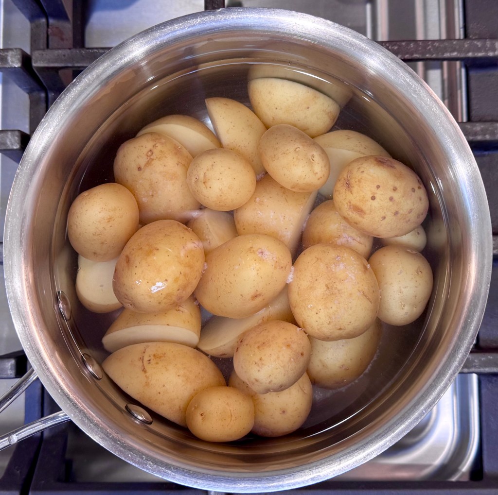 Lightly oil baking dish. I prefer a metal pan as it just seems to roast better. Cut the larger potatoes into equal size pieces or use fingerlings. Place into a pan and cover with cold water. Bring it up to a boil and let boil for about 6 minutes. Parboiling these potatoes will allow them to roast better later. After 6 minutes of boiling, drain and place into a bowl.