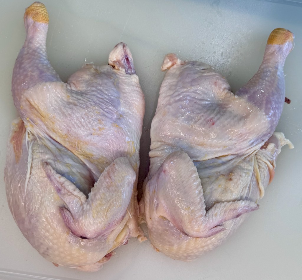 Split the chicken in half with kitchen shears or a big huge knife. Trim excess fat off of it..