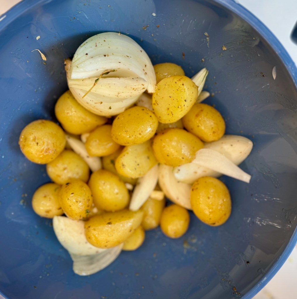 Place the potatoes and onions all around the chicken. Drizzle the extra lemony oil from the bowl on all of it.
