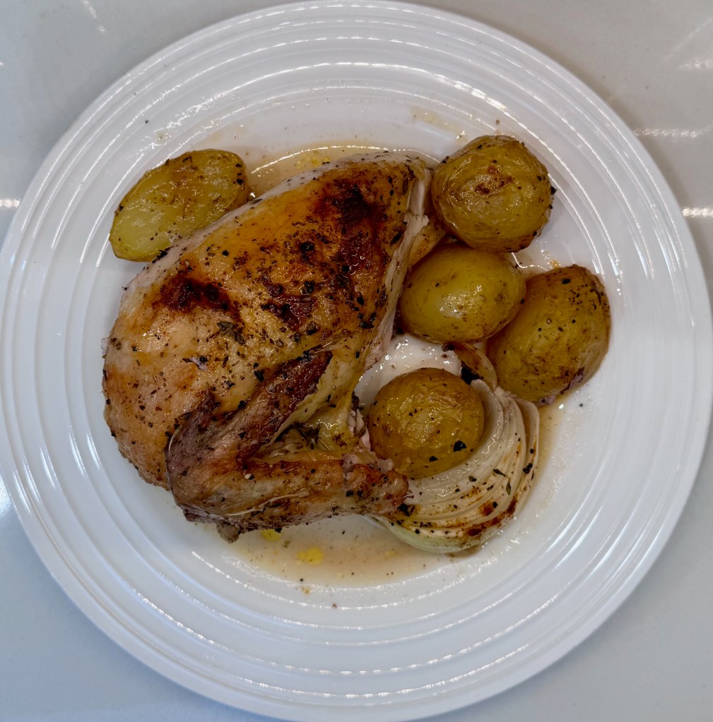 The challenge is to make sure the potatoes are done at the same time as the chicken. It’s really easy to roast the chicken and have uncooked potatoes. My mom actually roasted them separately. I think I have found a winner with 2 simple steps and used one baking pan.