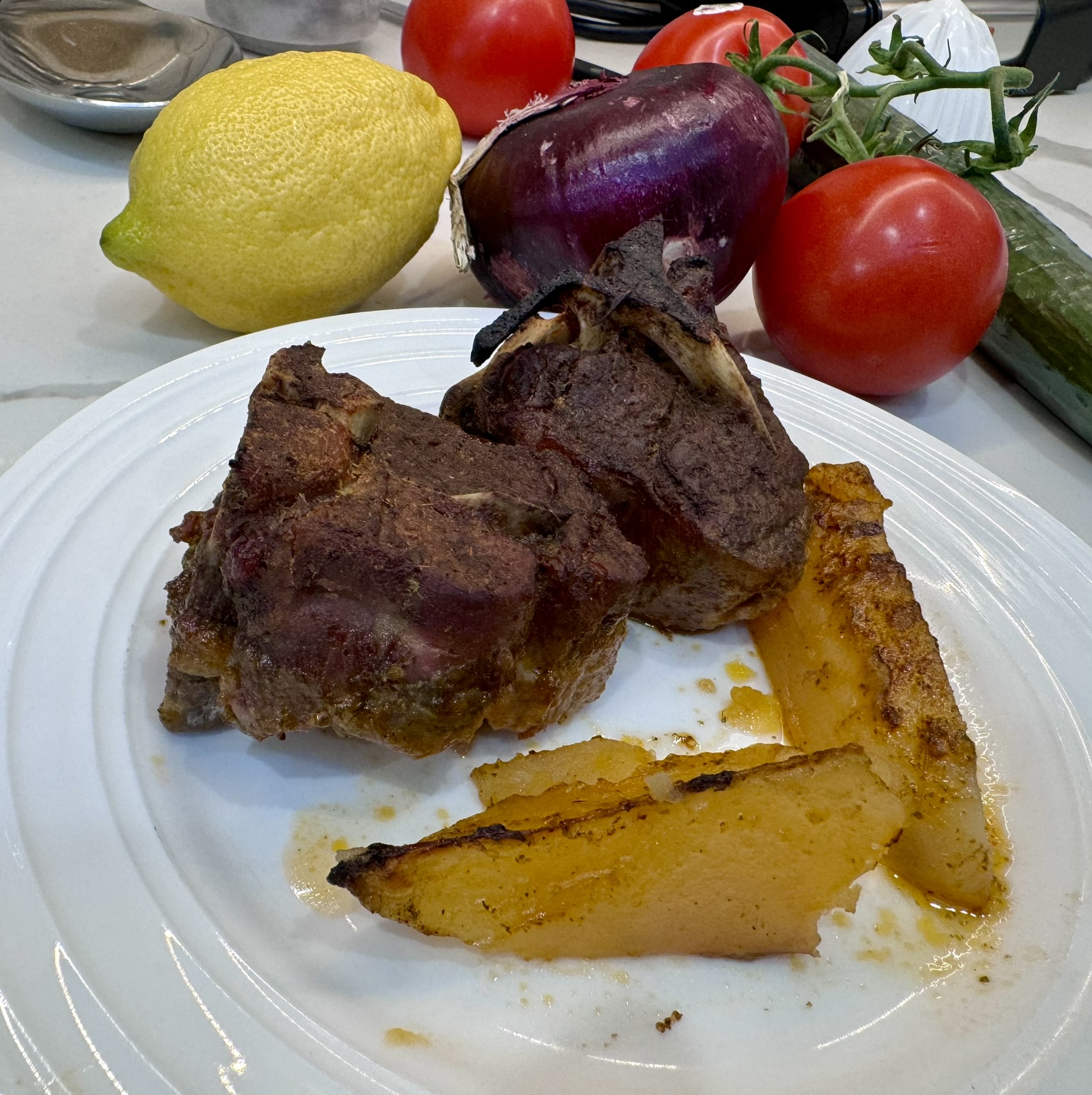 A RUSTIC GREEK DISH OF LAMB CHOPS SLOWLY ROASTED IN A RICH TOMATO SAUCE WITH GARLIC AND HERBS