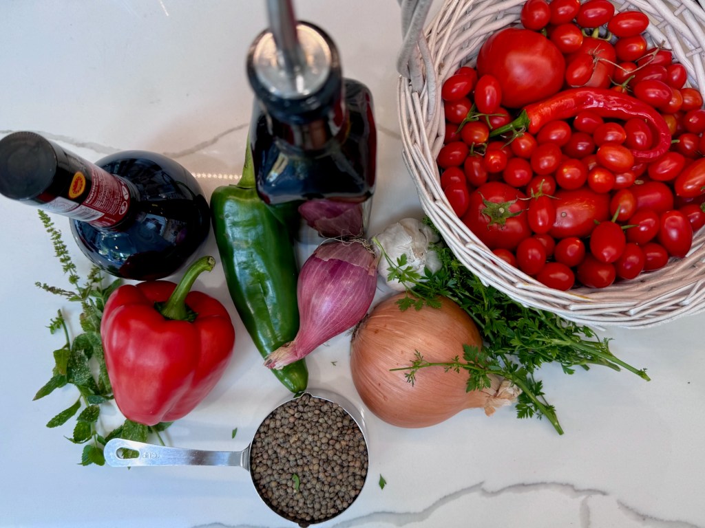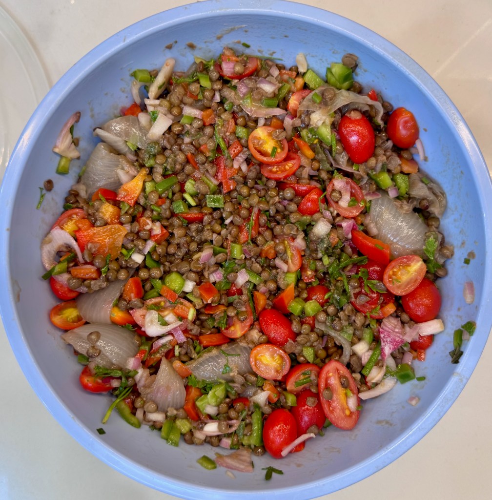 The warm summer months brought a bumper crop of tomatoes and peppers in my yard. So, I decided to make a lentil salad.
