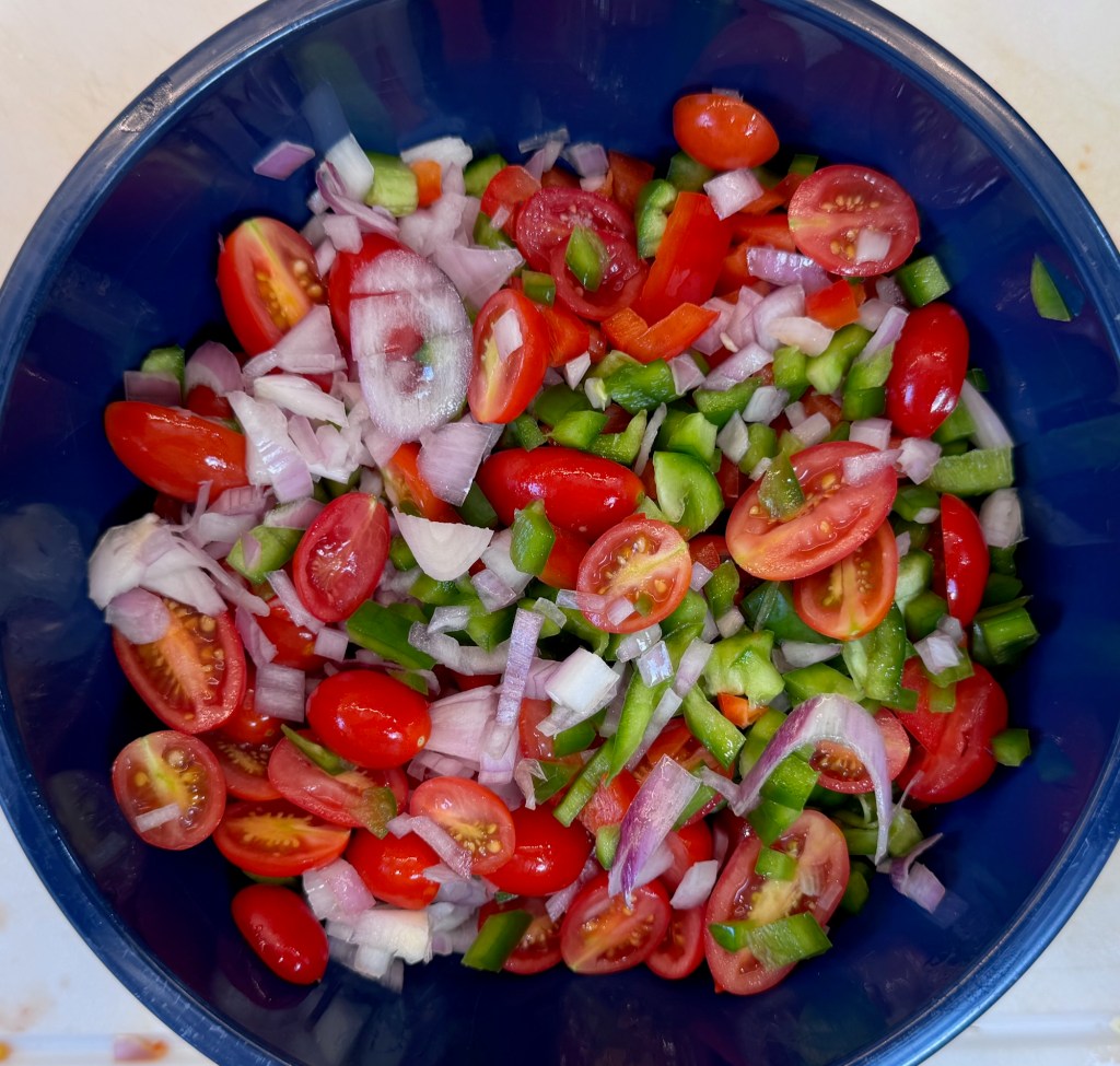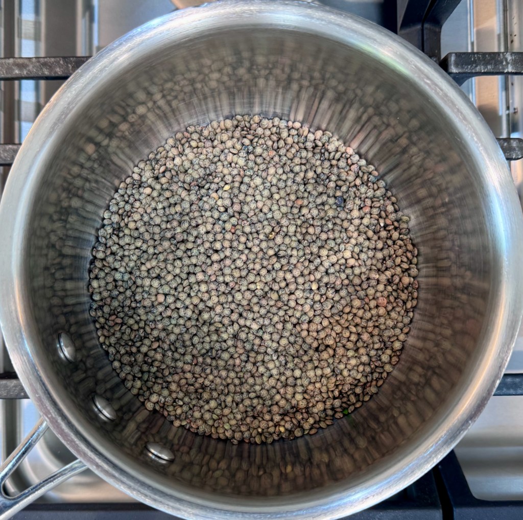 I think he used regular lentils in his video clip. I am using French green lentils. I have an unused bag of them. They hold their texture really well after cooking. The recipe had tomatoes, onion, and pepper. I’m also throwing in a touch of mint, parsley, and chives. I need to do this before the season ends on them. This will add a green hit to it.
