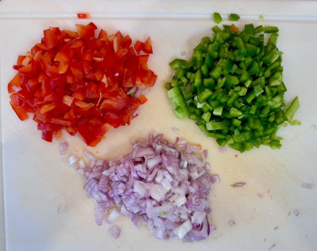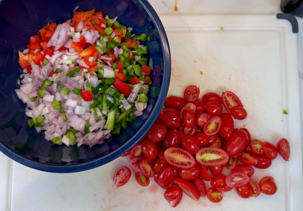 While lentils cook, cut the pepper, shallot, herbs and tomatoes for the salad.