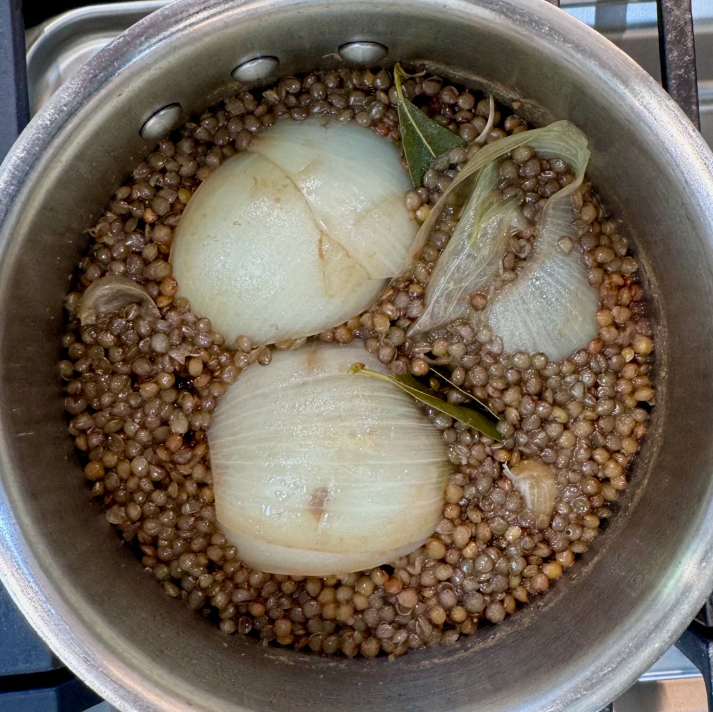 Put a cup of lentils in a pot and cover with water to an inch or 1.5 inches above lentils. Add bay leaves, garlic cloves, olive oil, and onion to pot. Bring to a boil, then lower to a simmer and cook for about 30 minutes. The lentils will get much larger and absorb much of the water and oil.