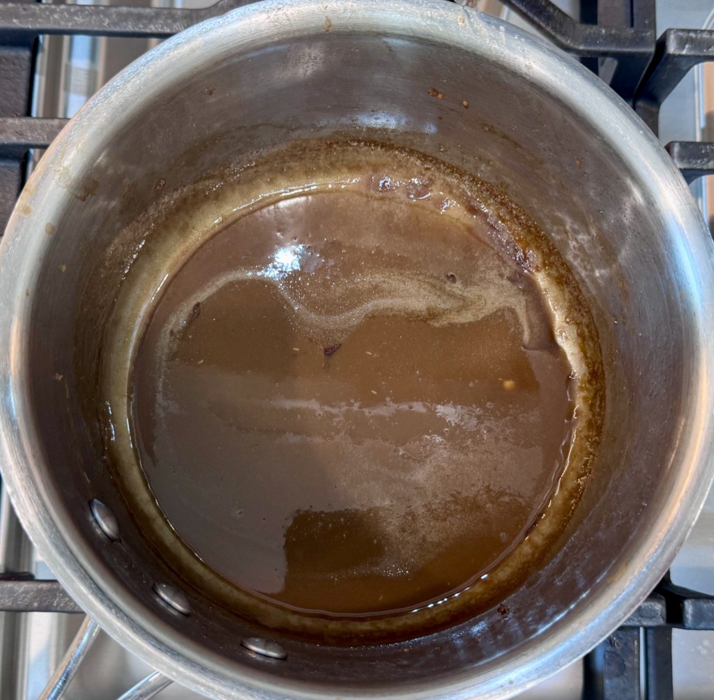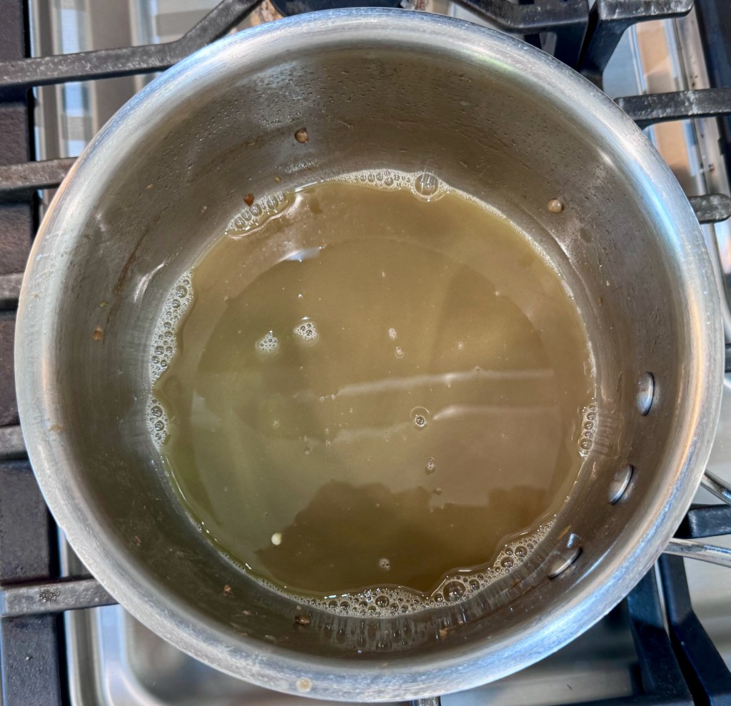 Strain cooked lentils into a bowl. Take reserved cooking liquid and reduce in pan for about 5 minutes until thick.