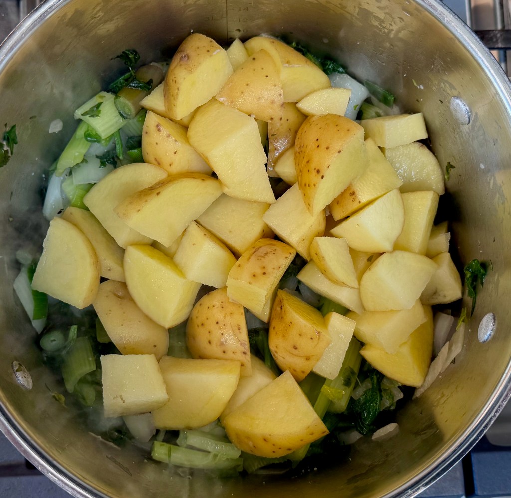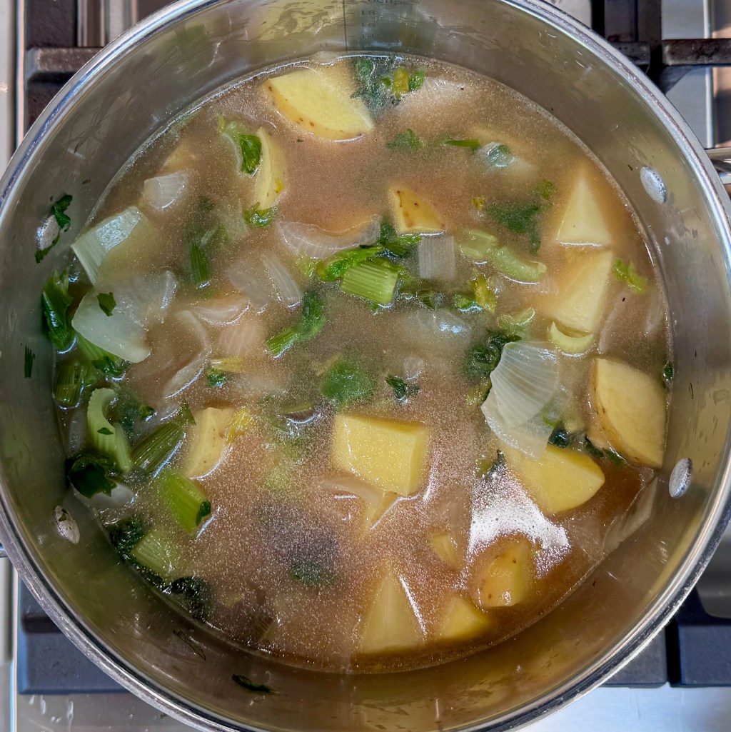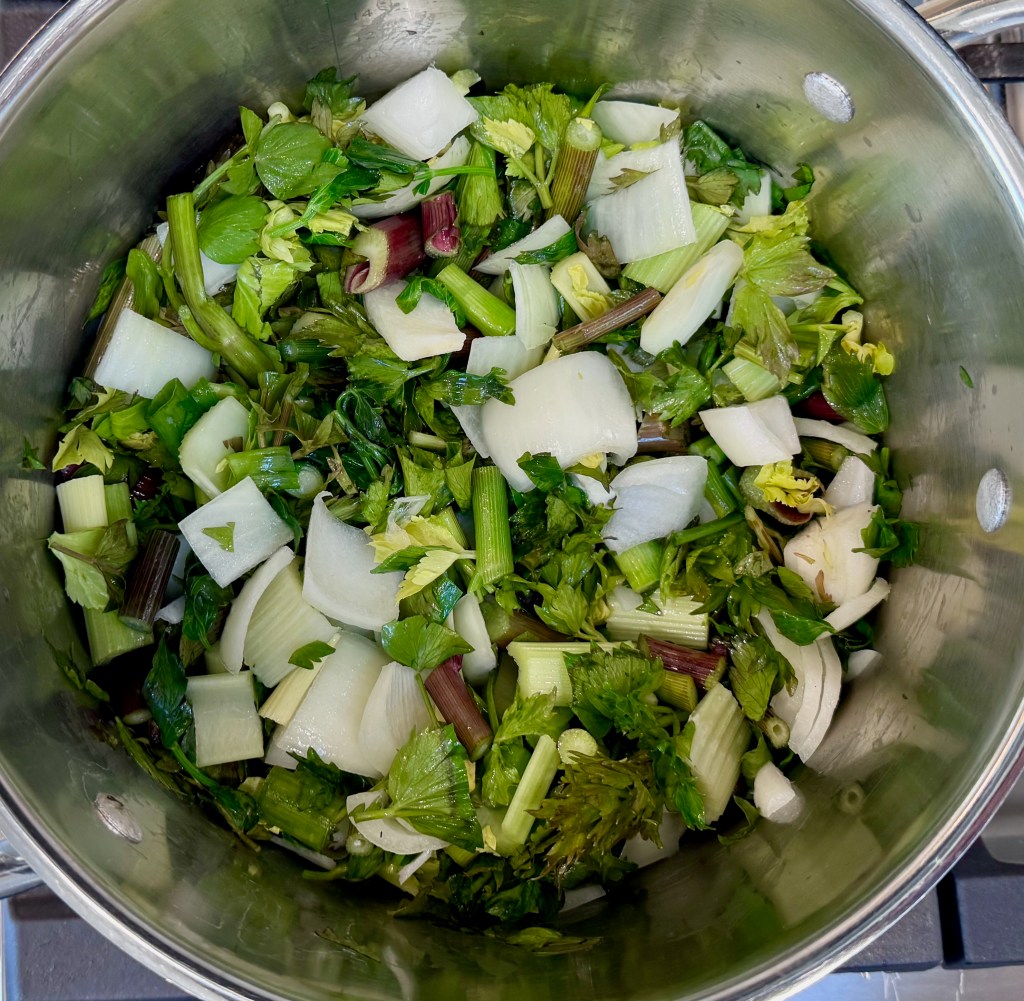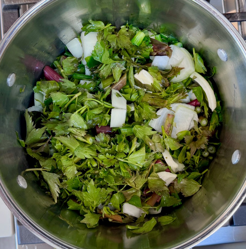 - Add the onion, green onions, celery stalks, lovage, and sauté until softened, about 5 minutes.