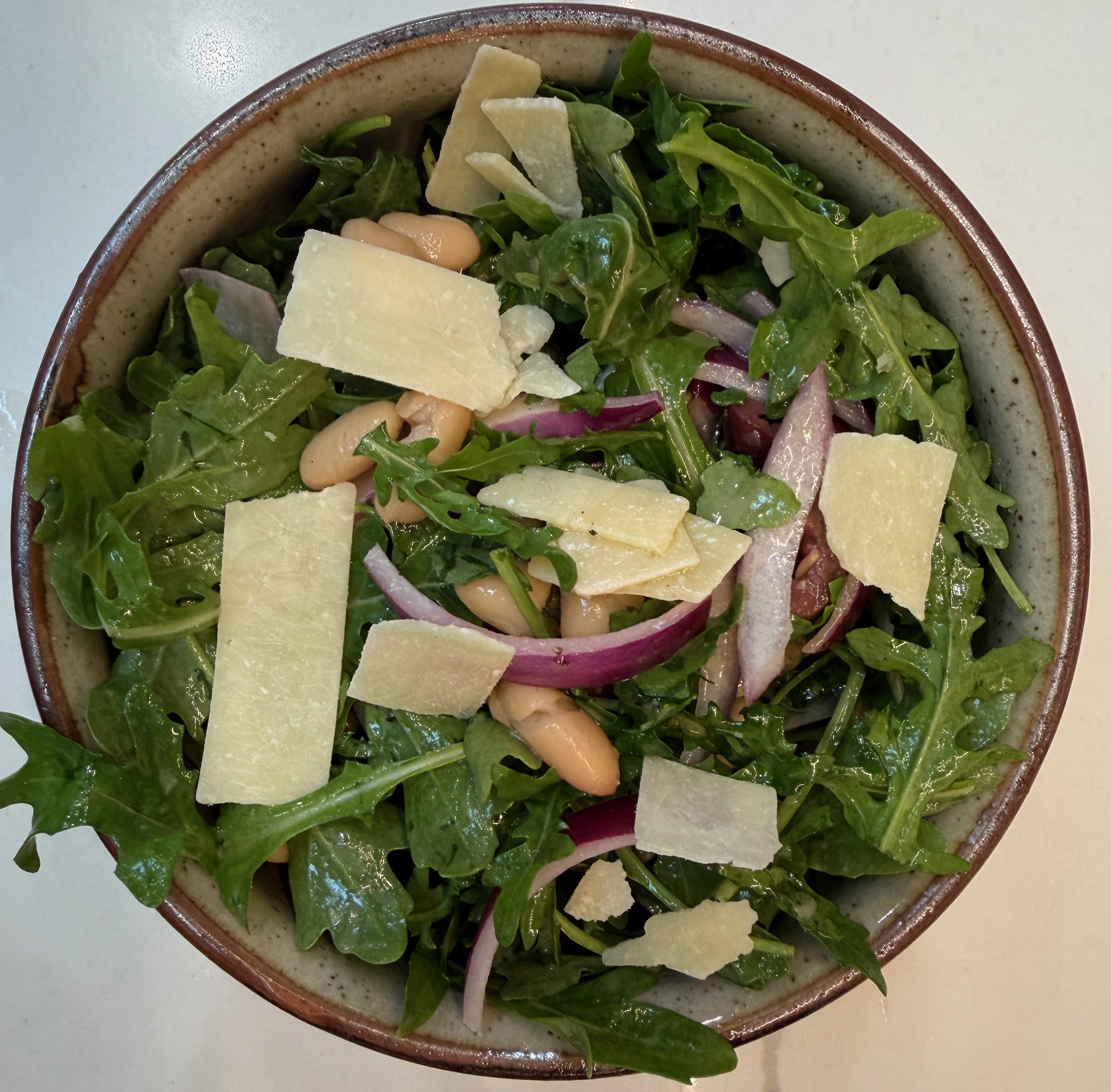 I had arugula on hand, a can of white beans, and the usual lineup sitting in the fridge – Kalamata olives, capers, and a red onion. That’s already most of the work done. From there, it’s just a matter of putting it together and letting those ingredients do what they do.